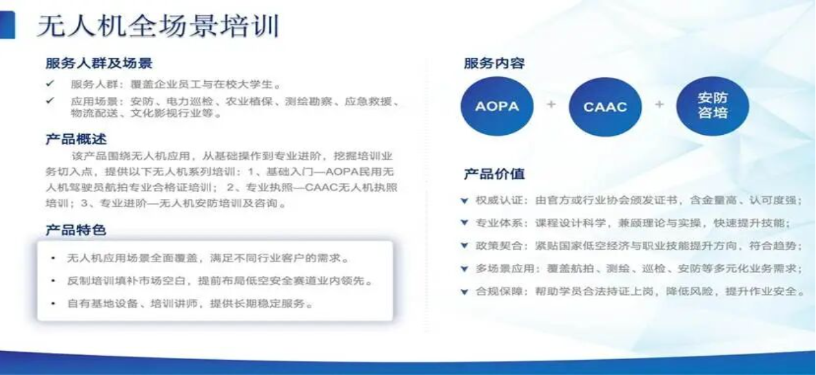 “无人机全场景培训”紧跟无人机产业政策发展趋势,构建“基础入门—专业执照—专业进阶”三层培训体系,涵盖AOPA民用无人机驾驶员航拍专业合格证、CAAC无人机执照、无人机安防培训及咨询服务,配备专业认证师资与标准化实操场地,助力个人技能提升与企业专业人才储备双向发展。