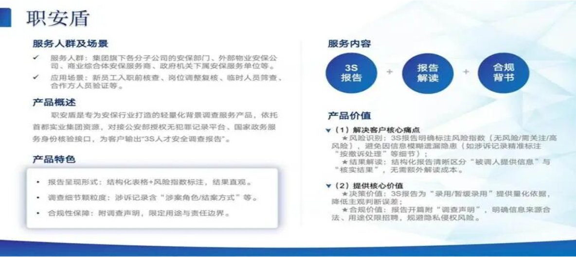 “职安盾”是专为安保行业打造的轻量化背景调查服务产品,依托首都实业集团资源,对接公安部授权无犯罪记录平台、国家政务服务身份核验接口,输出“3S人才安全调查报告”,从源头上为安保企业筑牢人才安全防线,其“职”“安”“盾”的命名逻辑,更直观传递出产品在人才安全领域的核心定位。