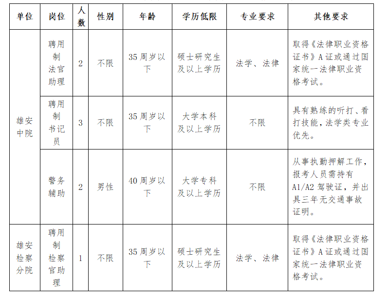 为进一步加强雄安新区法院、检察院聘用制人员队伍建设,根据相关规定和职位空缺情况,结合工作实际,现面向社会公开招聘聘用制人员8名。现将有关事项公告如下: