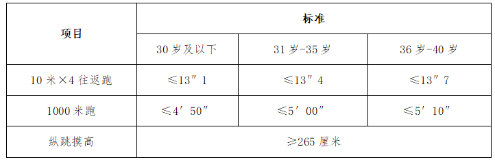报考警务辅助岗位的人员在笔试前需进行体能测试。体能测试项目和标准参照《公安机关录用人民警察体能测试项目和标准(暂行)》执行,共测试三项,采取单项淘汰制,单项任意一项不合格,即为不合格。全部达标为合格,方可进入笔试。测试标准如下。