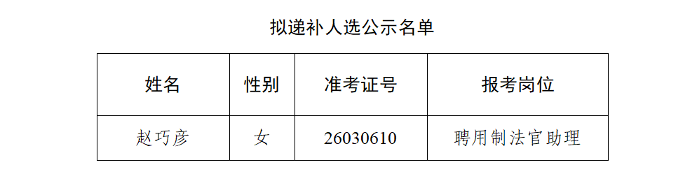 2025年12月12日,雄安中院发布了《2025年度公开招聘聘用制人员公告》(下称公告),面向社会公开招聘聘用制人员7名,《公告》中明确指出,报考人员的考试成绩在1年内有效,因聘用制人员离职等原因造成缺额的,可在考试人员中,按照综合成绩从高分到低分的原则确定递补人员。2026年2月,河北雄安新区中级人民法院有1名聘用制法官助理公示结束后自愿放弃岗位,根据《公告》及有关要求,经网上报名和资格审查、笔试、资格复审、面试、体检、政审等程序,现对拟递补人选进行公示,如对拟递补人选有异议,请于公示期内提出。